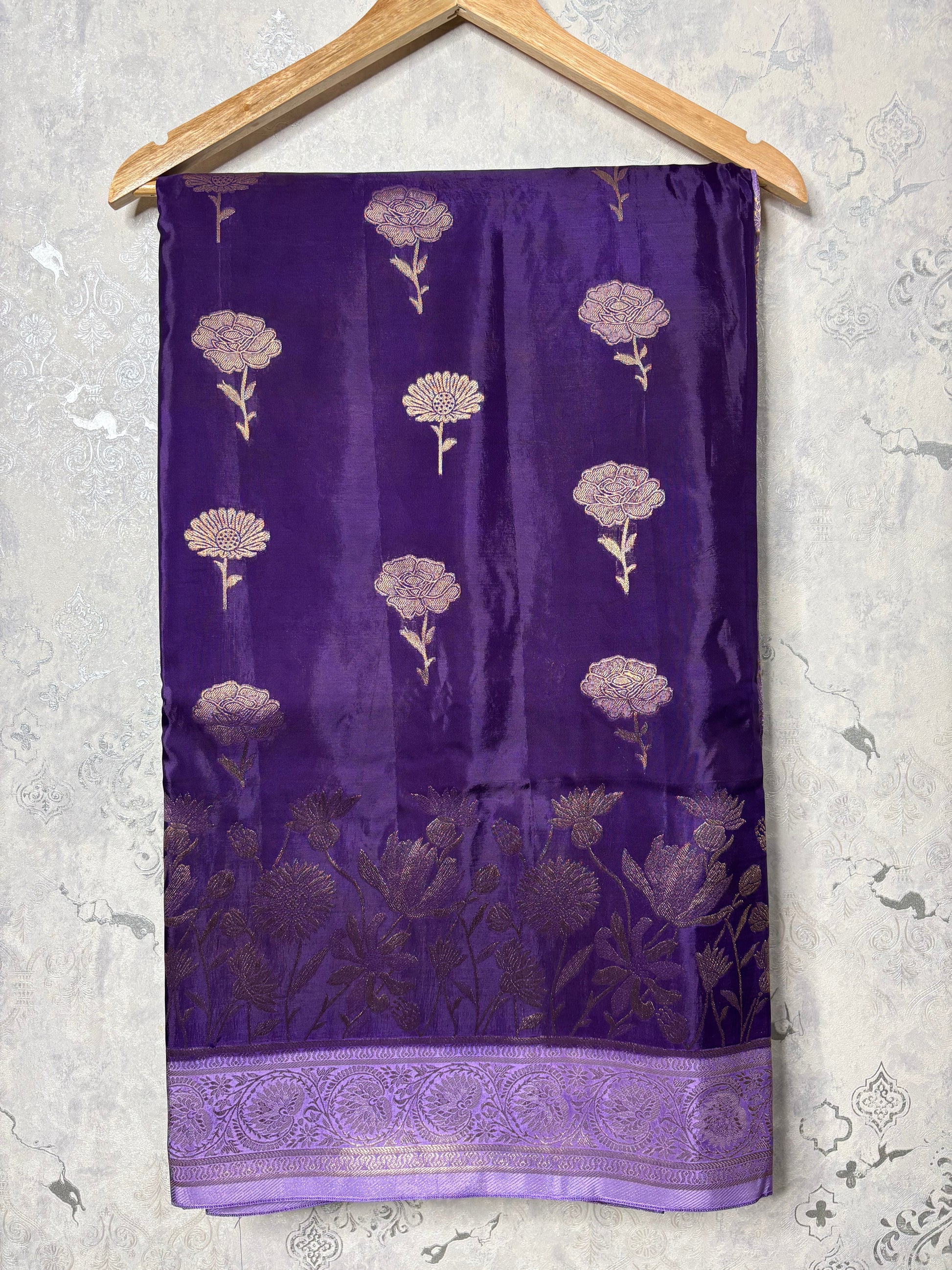 Beautiful Violet Banarasi silk saree with floral design.