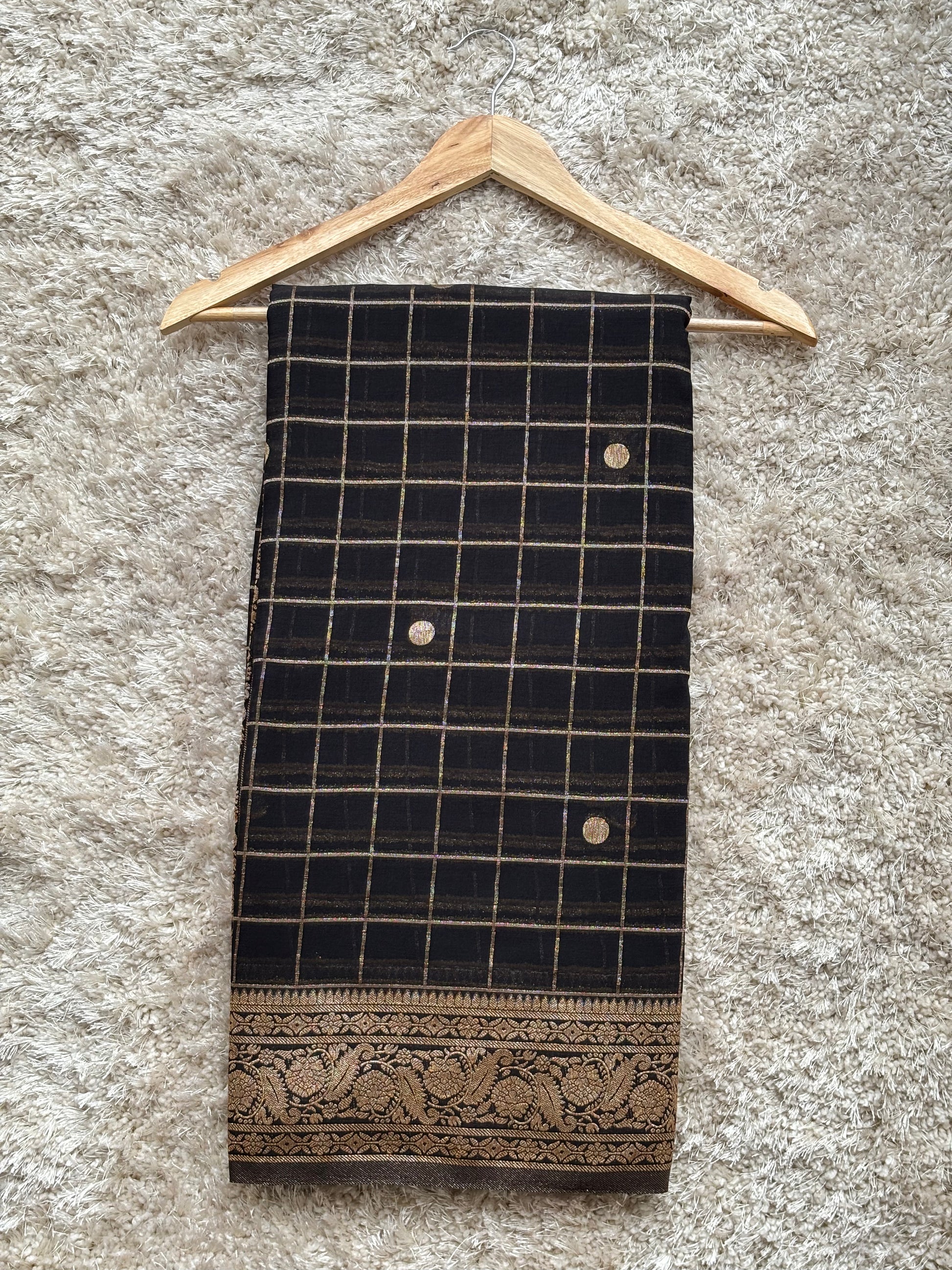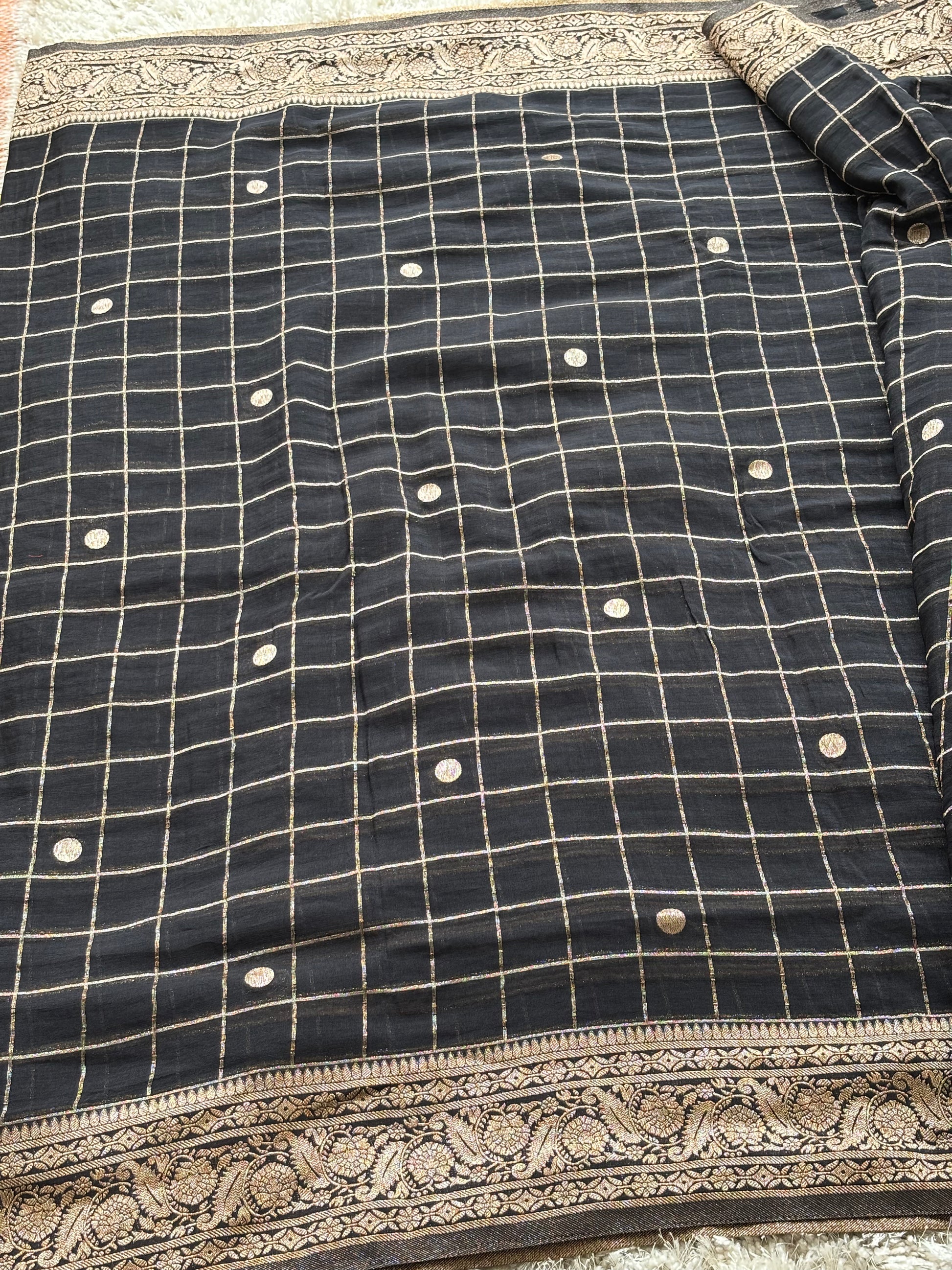A stunning blend of tradition and elegance, this Crepe Georgette saree features a beautifully woven body with subtle checks and intricate detailing. The rich zari pallu enhances its festive charm, while the self-color blouse with delicate buttas completes the look perfectly. A perfect choice for any celebration or special occasion.
