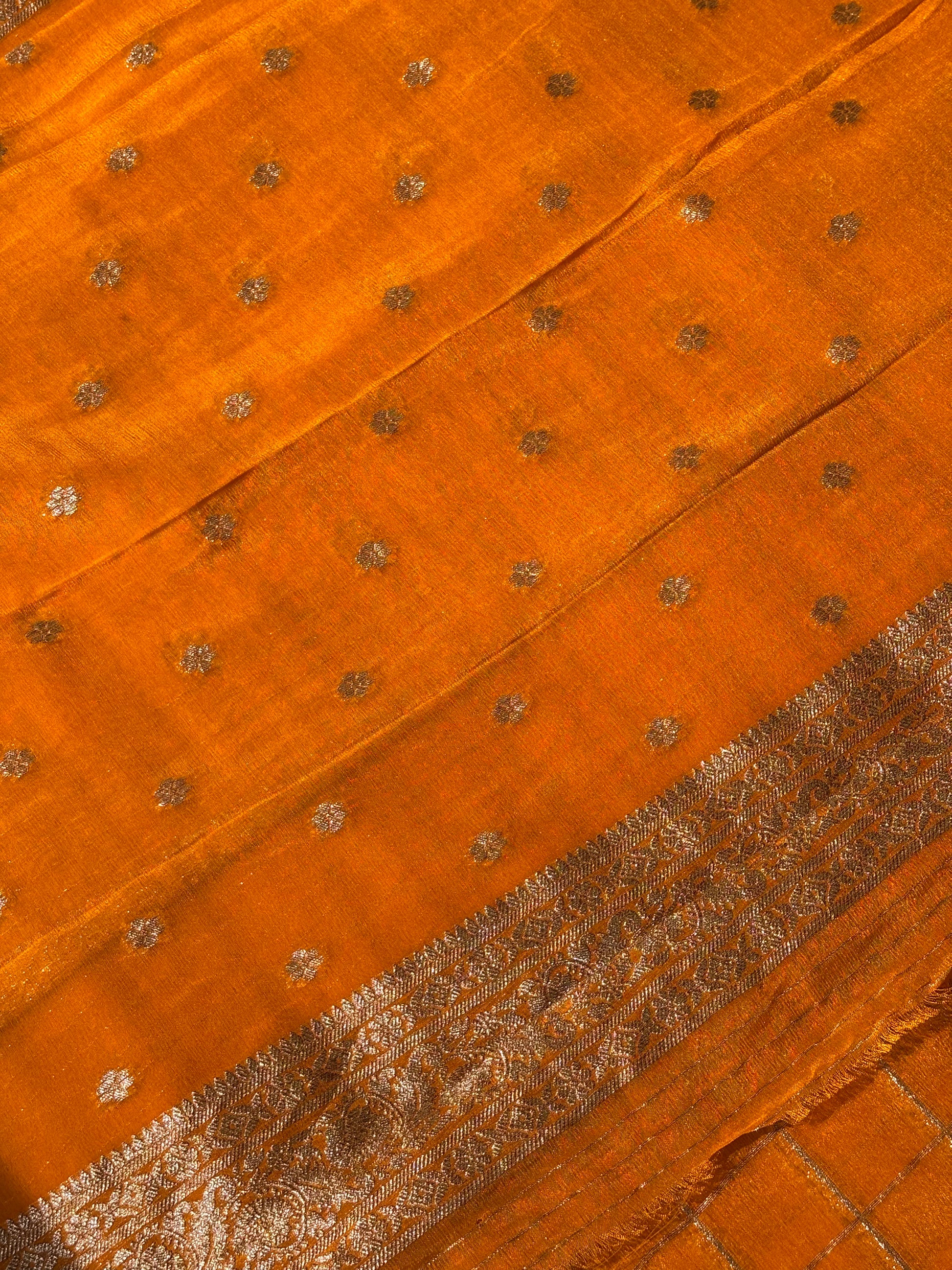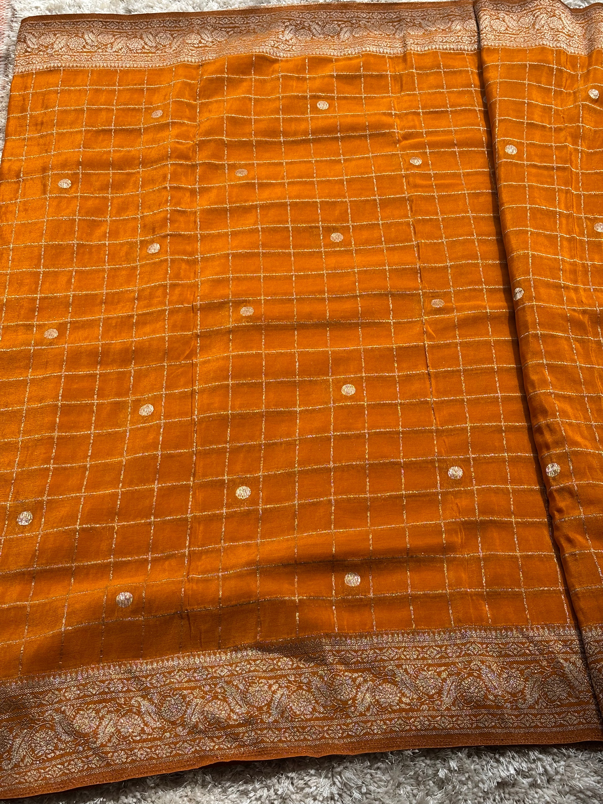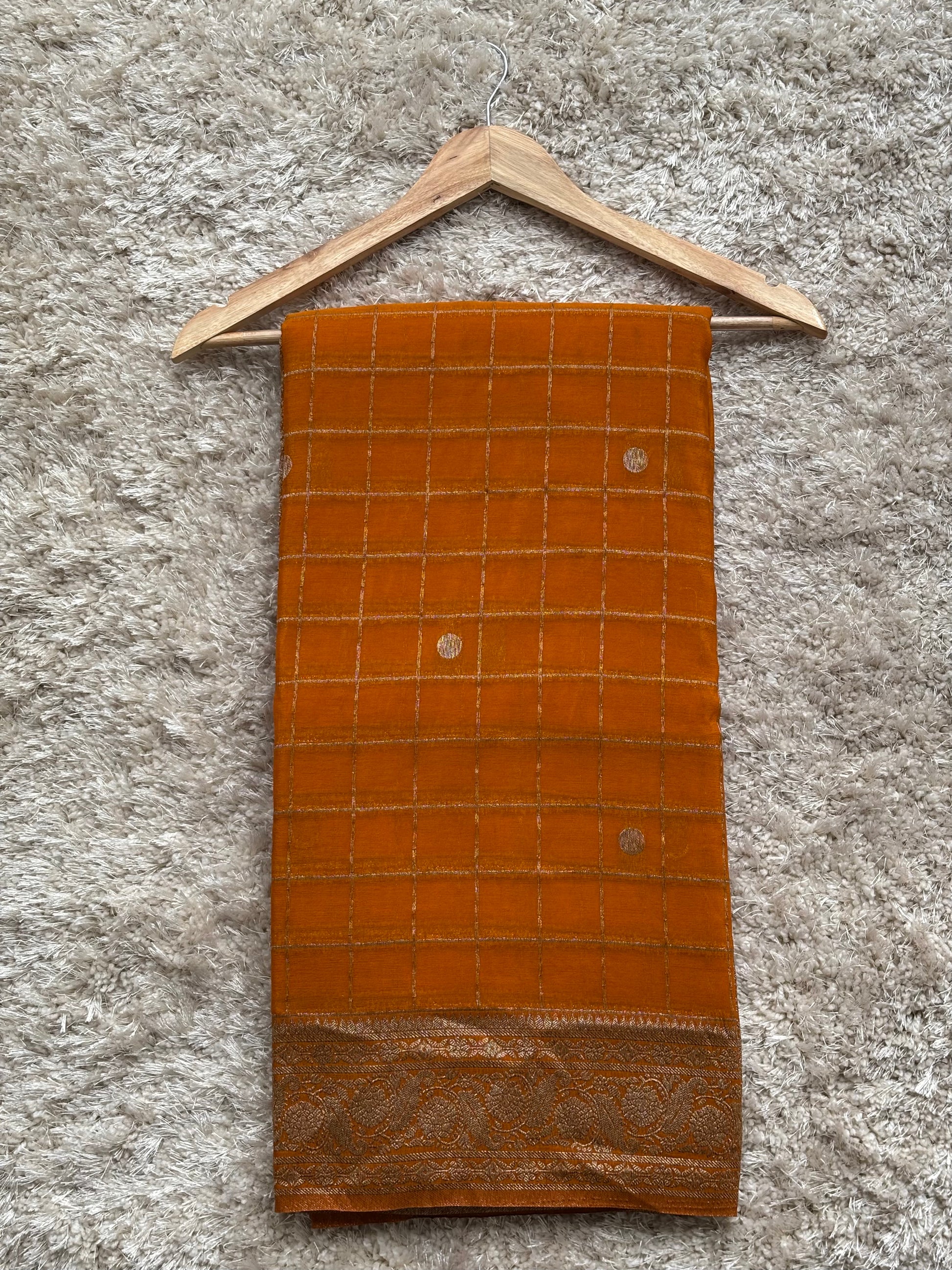 A stunning blend of tradition and elegance, this Crepe Georgette saree features a beautifully woven body with subtle checks and intricate detailing. The rich zari pallu enhances its festive charm, while the self-color blouse with delicate buttas completes the look perfectly. A perfect choice for any celebration or special occasion.