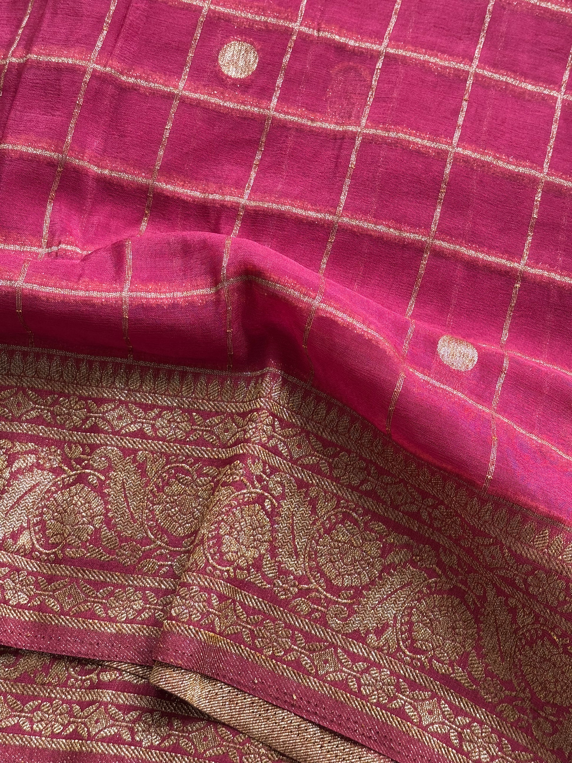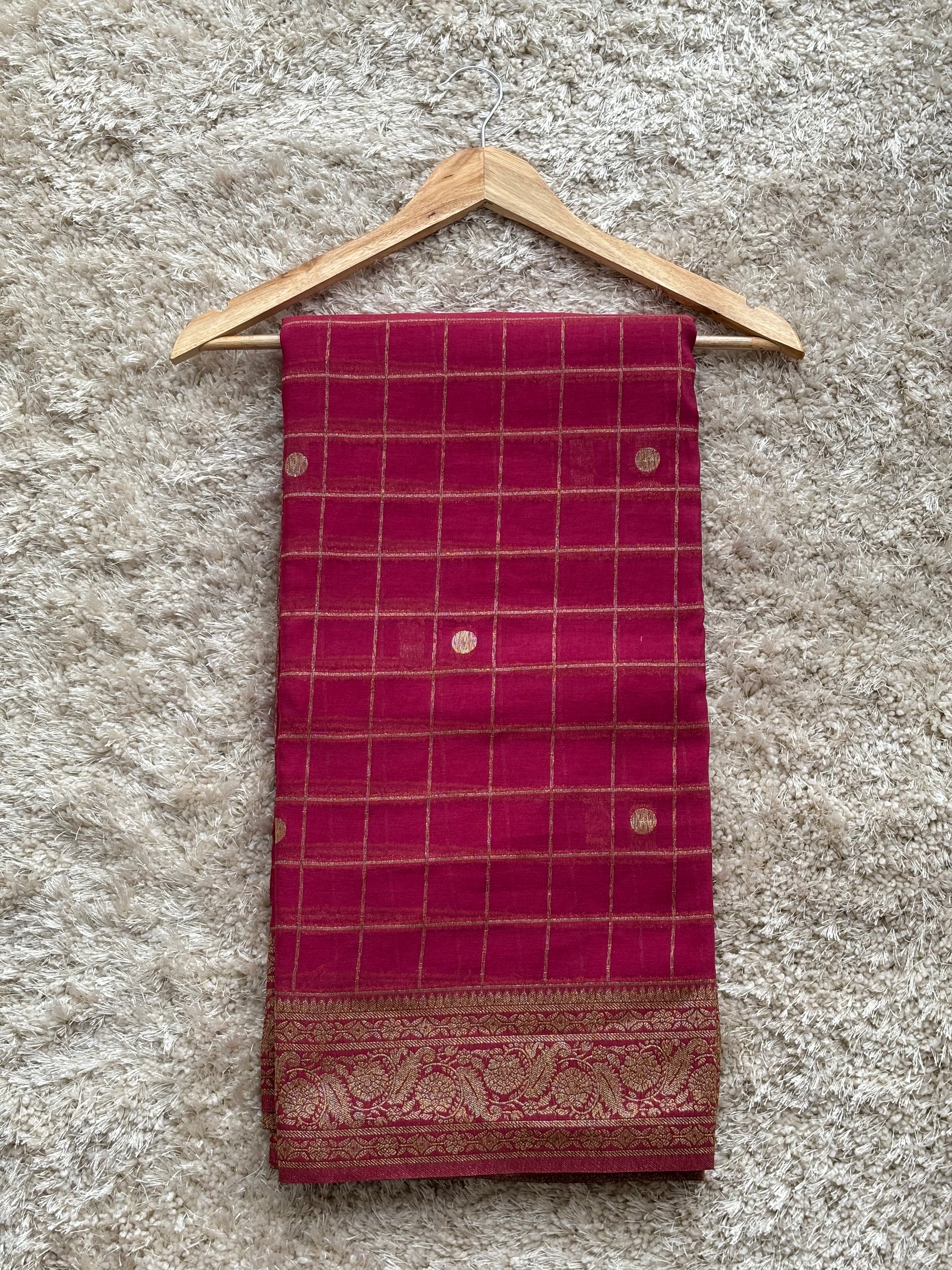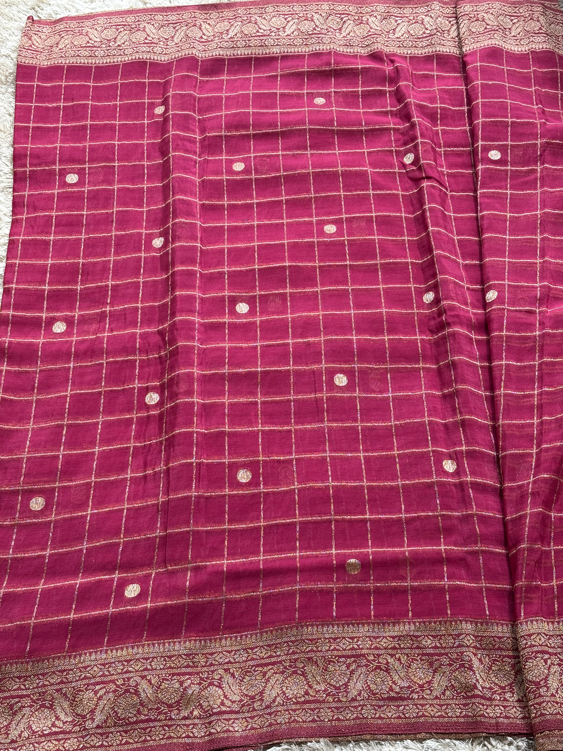A stunning blend of tradition and elegance, this Crepe Georgette saree features a beautifully woven body with subtle checks and intricate detailing. The rich zari pallu enhances its festive charm, while the self-color blouse with delicate buttas completes the look perfectly. A perfect choice for any celebration or special occasion.