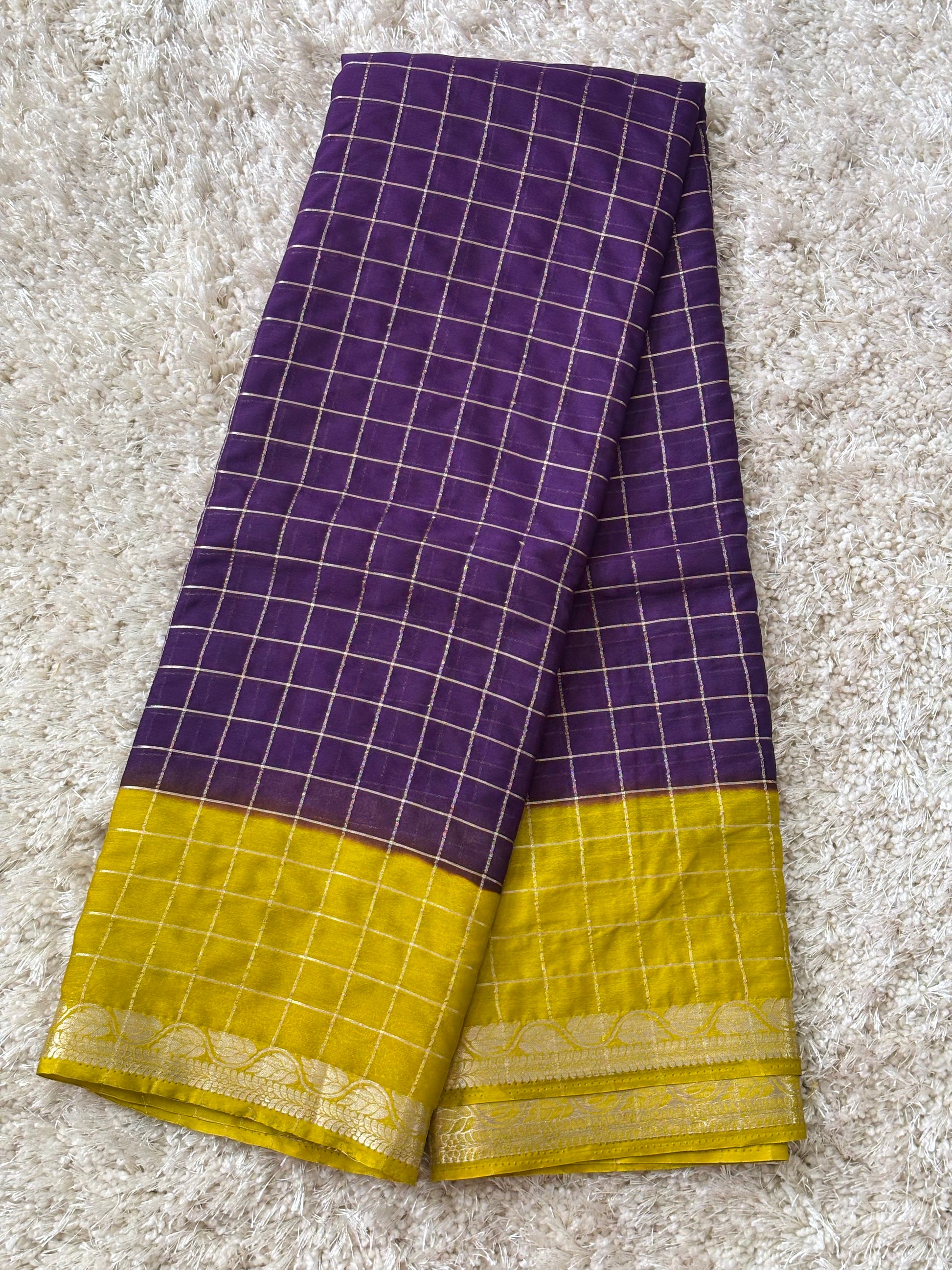 Purple crepe georgette saree with gold zari checks all over and a bright mustard yellow border featuring subtle gold detailing. Lightweight, flowy, and perfect for festive wear, parties, or special occasions.