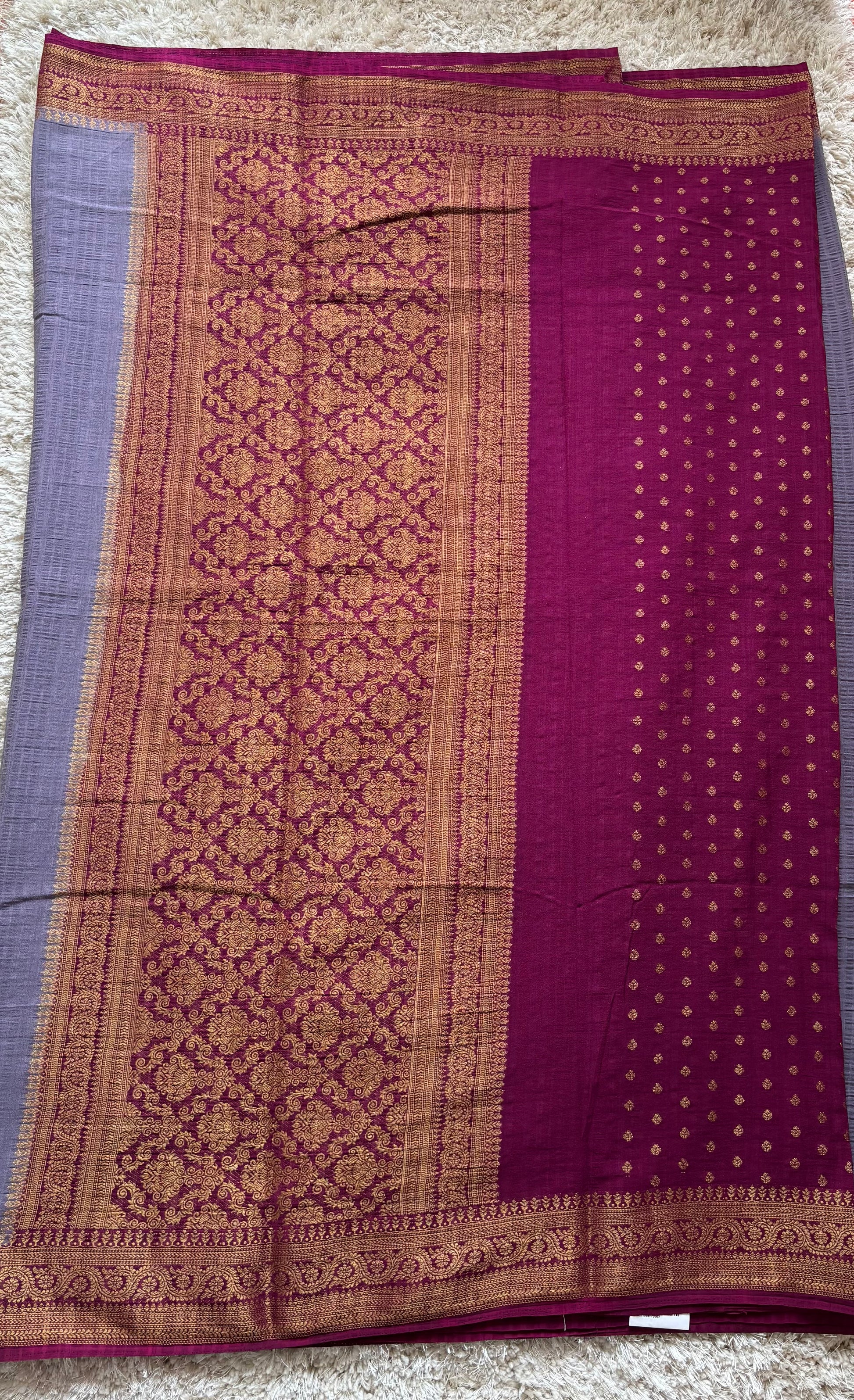 Beautifully crafted Crepe Tussar Georgette saree featuring a subtle self-texture and an elegant zari border. It comes with a contrasting blouse adorned with delicate buttas, adding a graceful touch. Soft, lightweight, and easy to drape — perfect for festive occasions, celebrations, and special events.