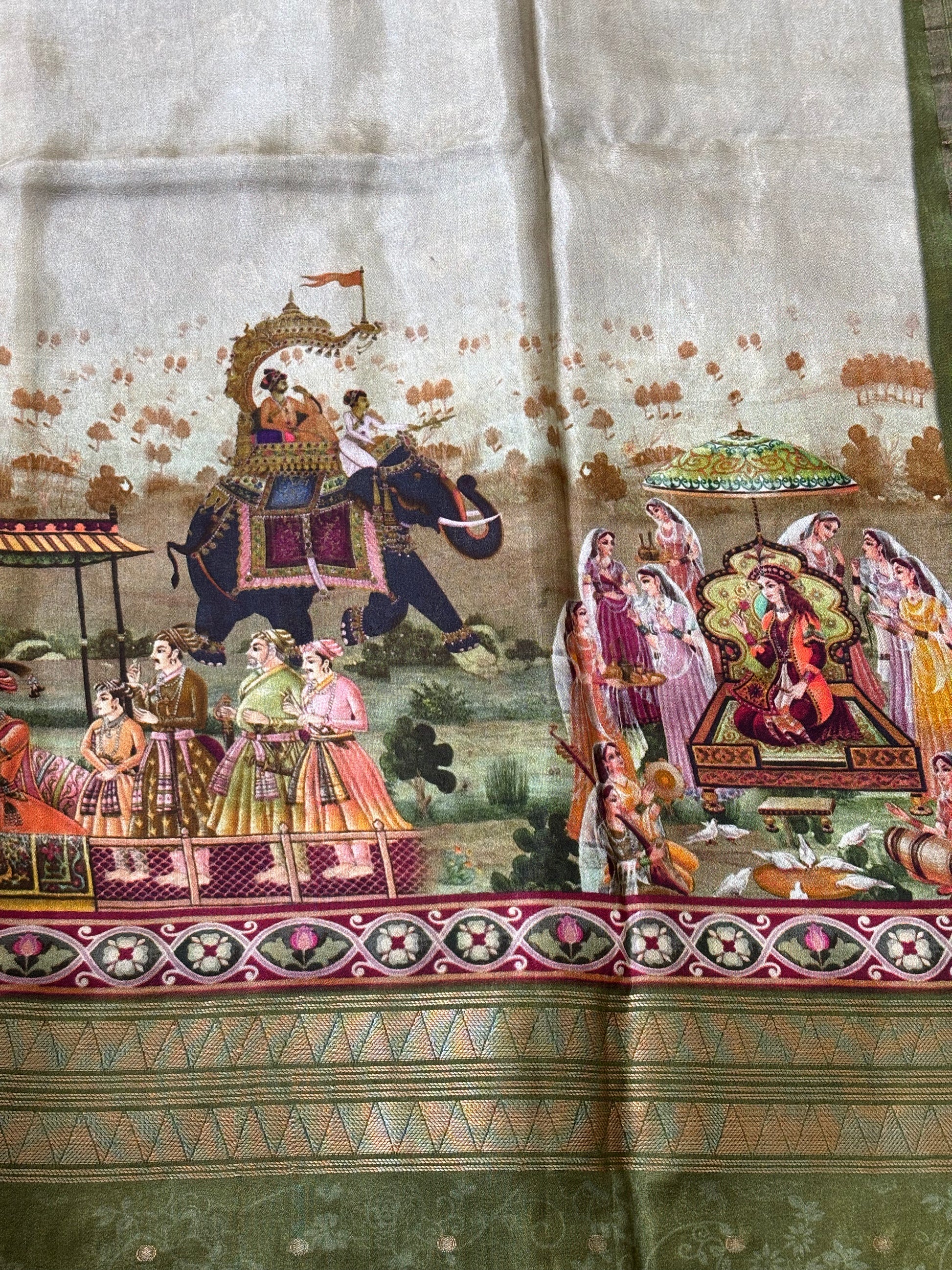 Crepe silk saree with elegant gold zari borders that add a rich and timeless touch. The highlight of the saree is its vibrant digital print pallu, featuring floral motifs and nature-inspired designs in shades bringing a perfect balance of tradition and modern artistry. Lightweight, soft, and flowy, this saree is ideal for both festive occasions and sophisticated gatherings.