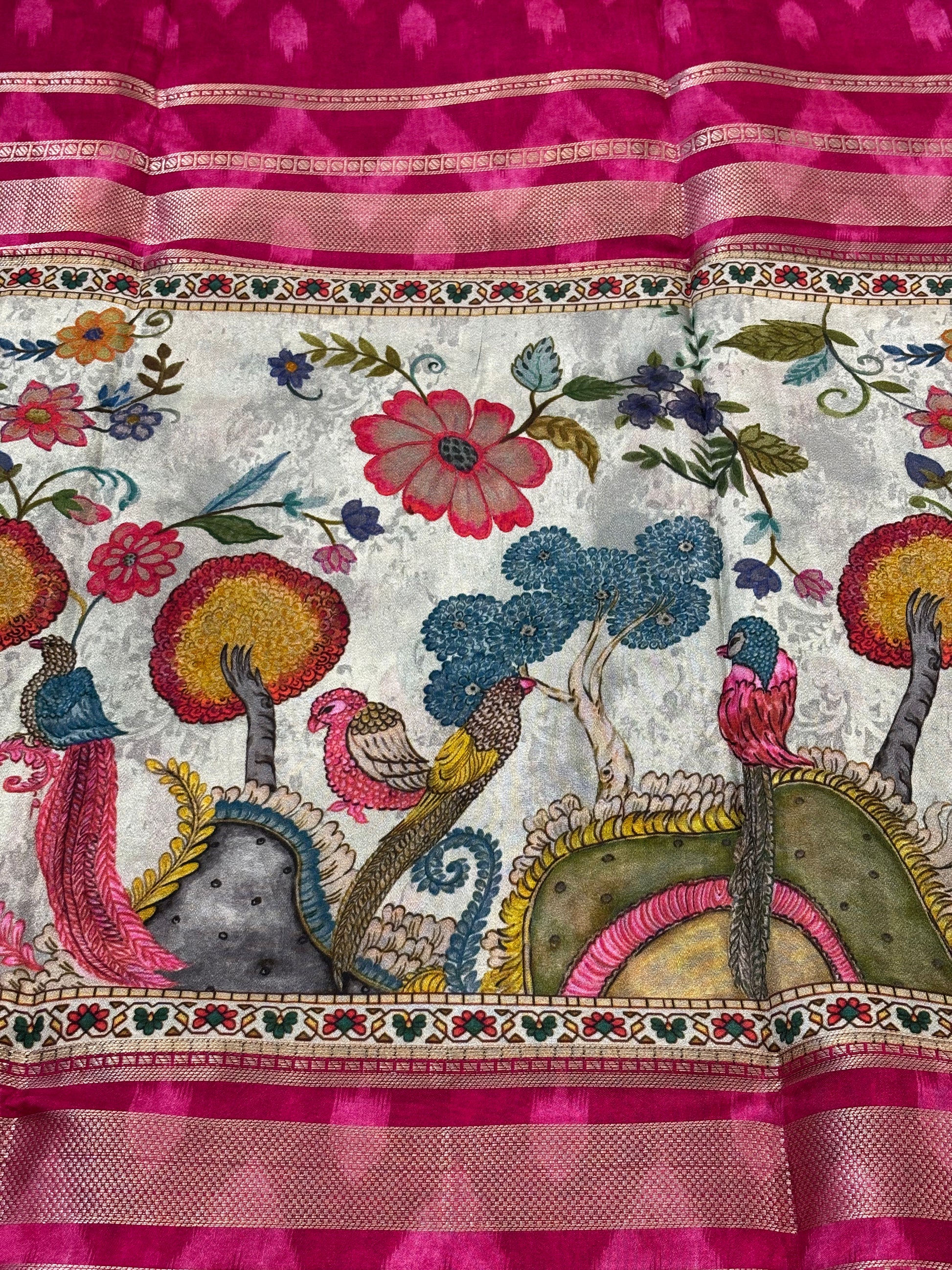 Crepe silk saree with elegant gold zari borders that add a rich and timeless touch. The highlight of the saree is its vibrant digital print pallu, featuring floral motifs and nature-inspired designs in shades bringing a perfect balance of tradition and modern artistry. Lightweight, soft, and flowy, this saree is ideal for both festive occasions and sophisticated gatherings.