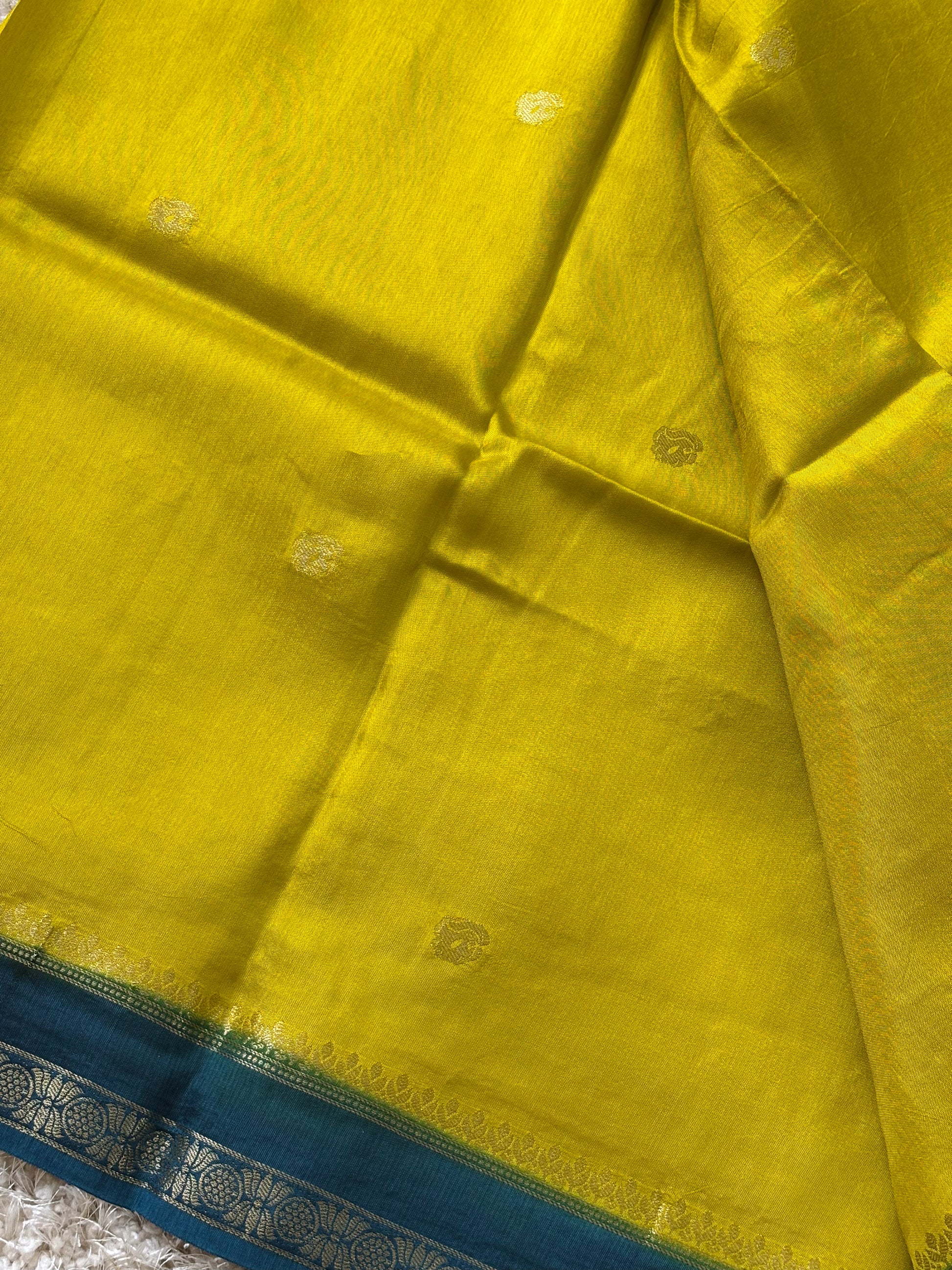 Lime yellow & Teal saree adorned with delicate zari motifs and a rich pink border. Perfect for festive and traditional occasions.