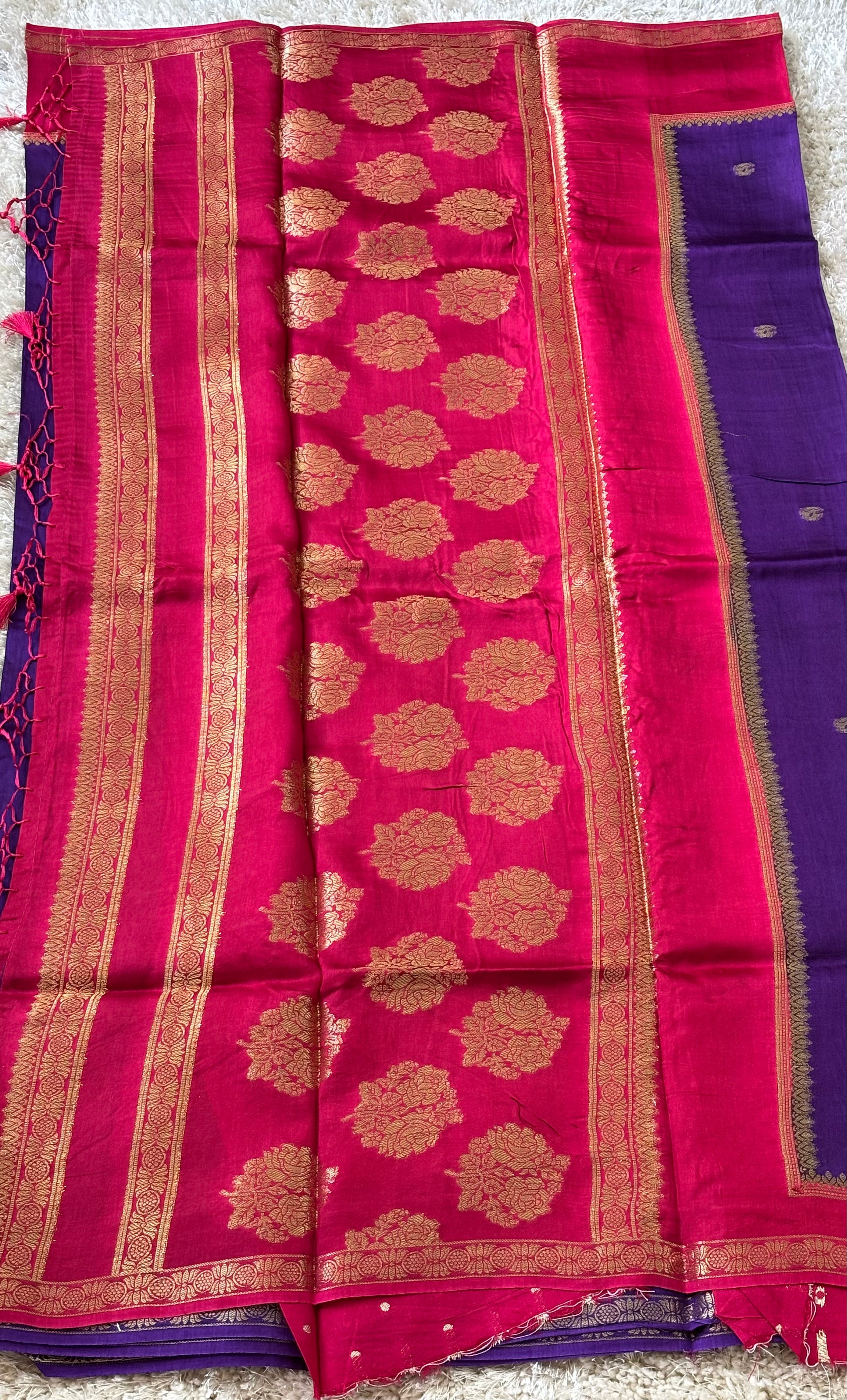 Purple saree adorned with delicate zari motifs and a rich pink border. Perfect for festive and traditional occasions.