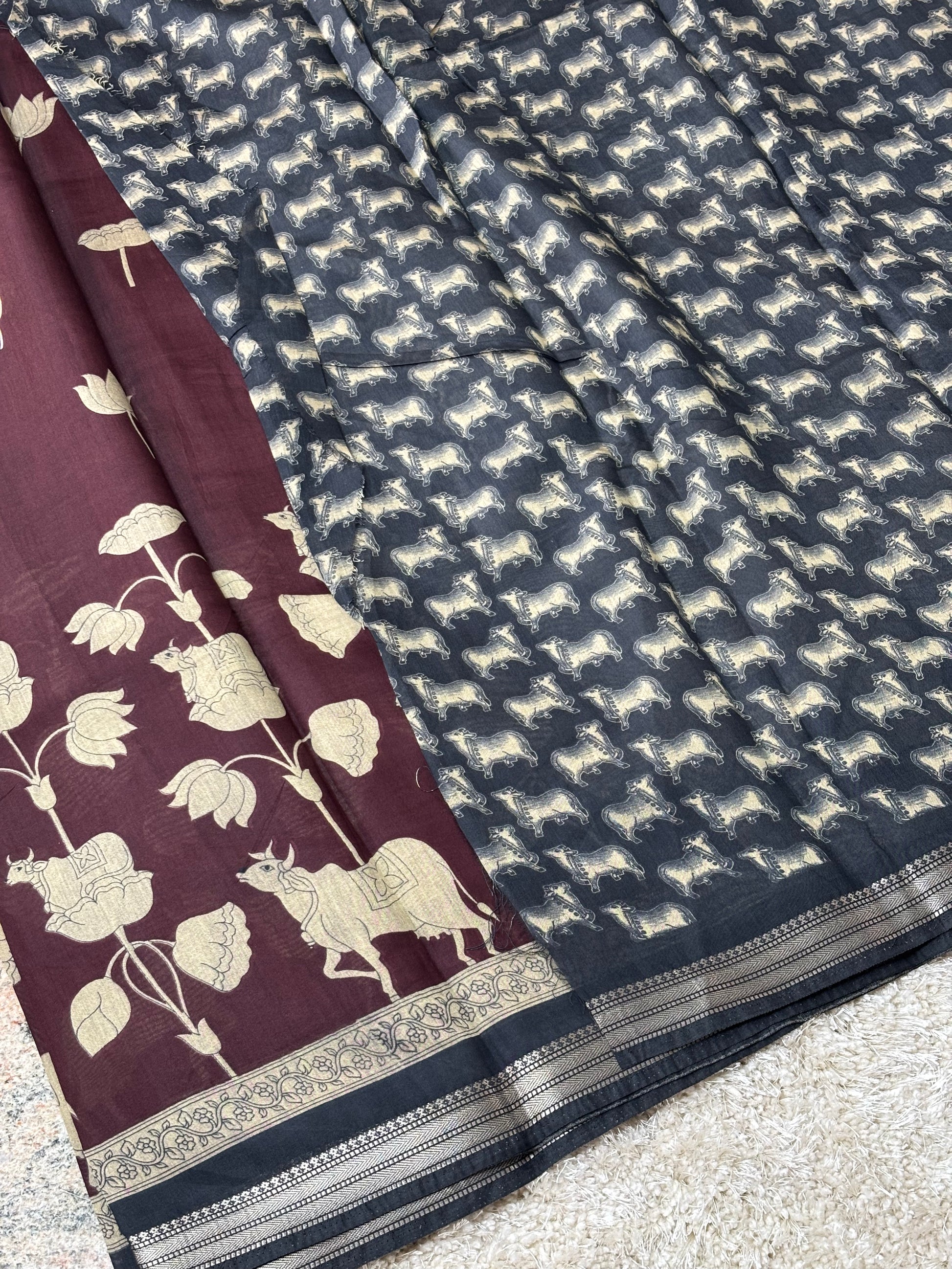 Graceful saree adorned with all-over Pichwai print featuring lotus and cow motifs, paired with a stunning Kalamkari pallu.