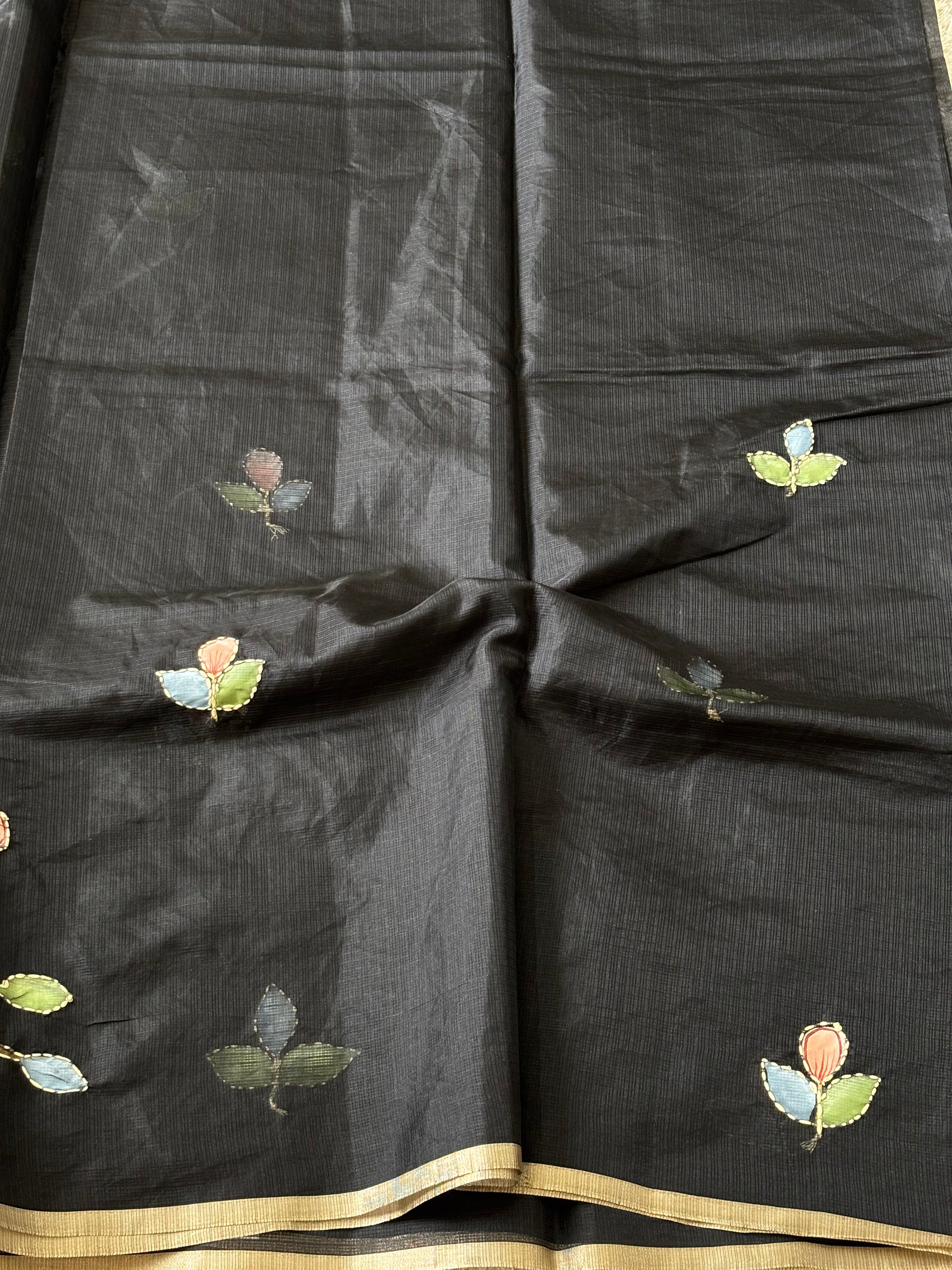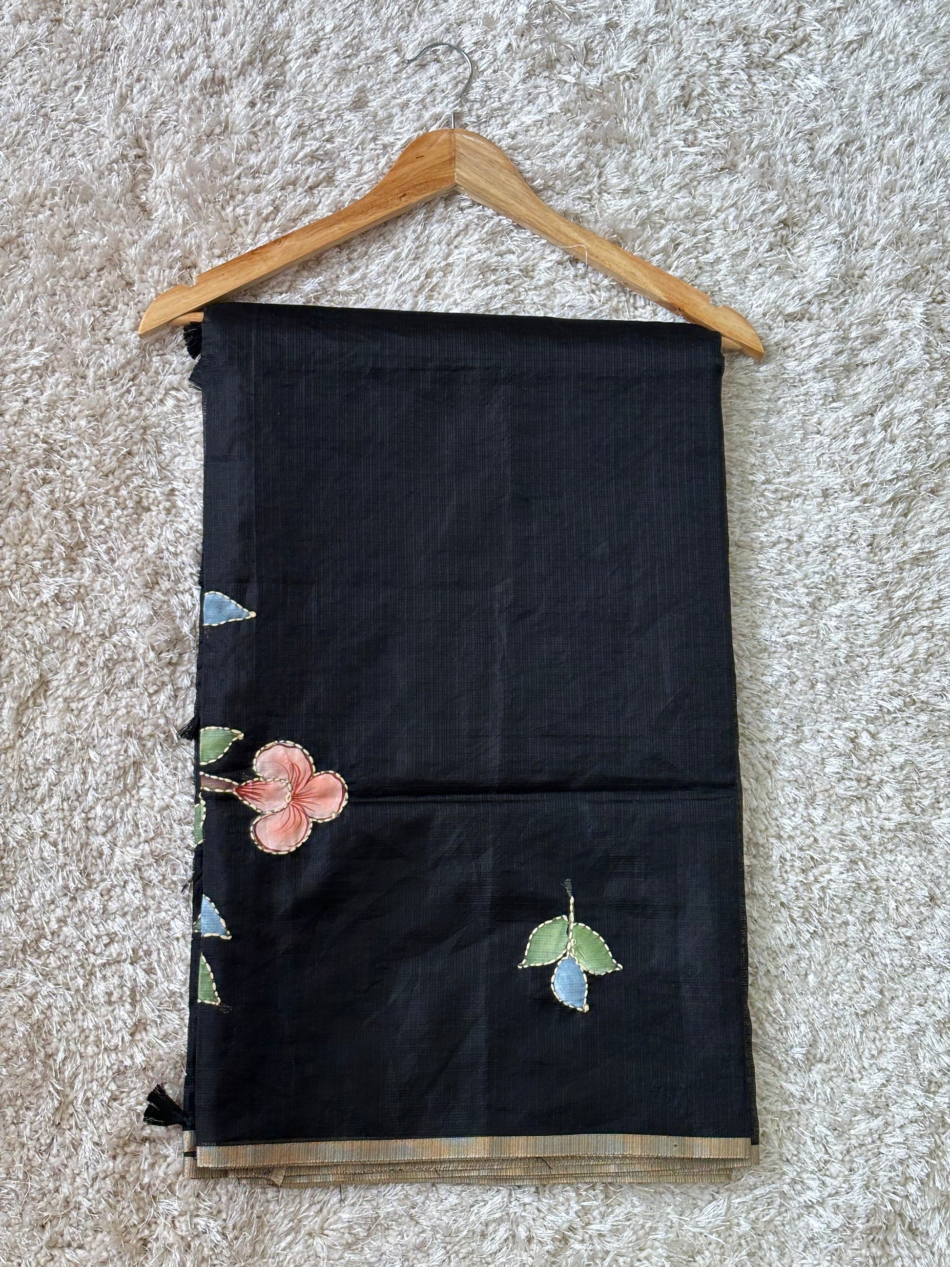 Black saree with exquisite hand brush paint appliqué work, featuring floral detailing that makes it truly unique.