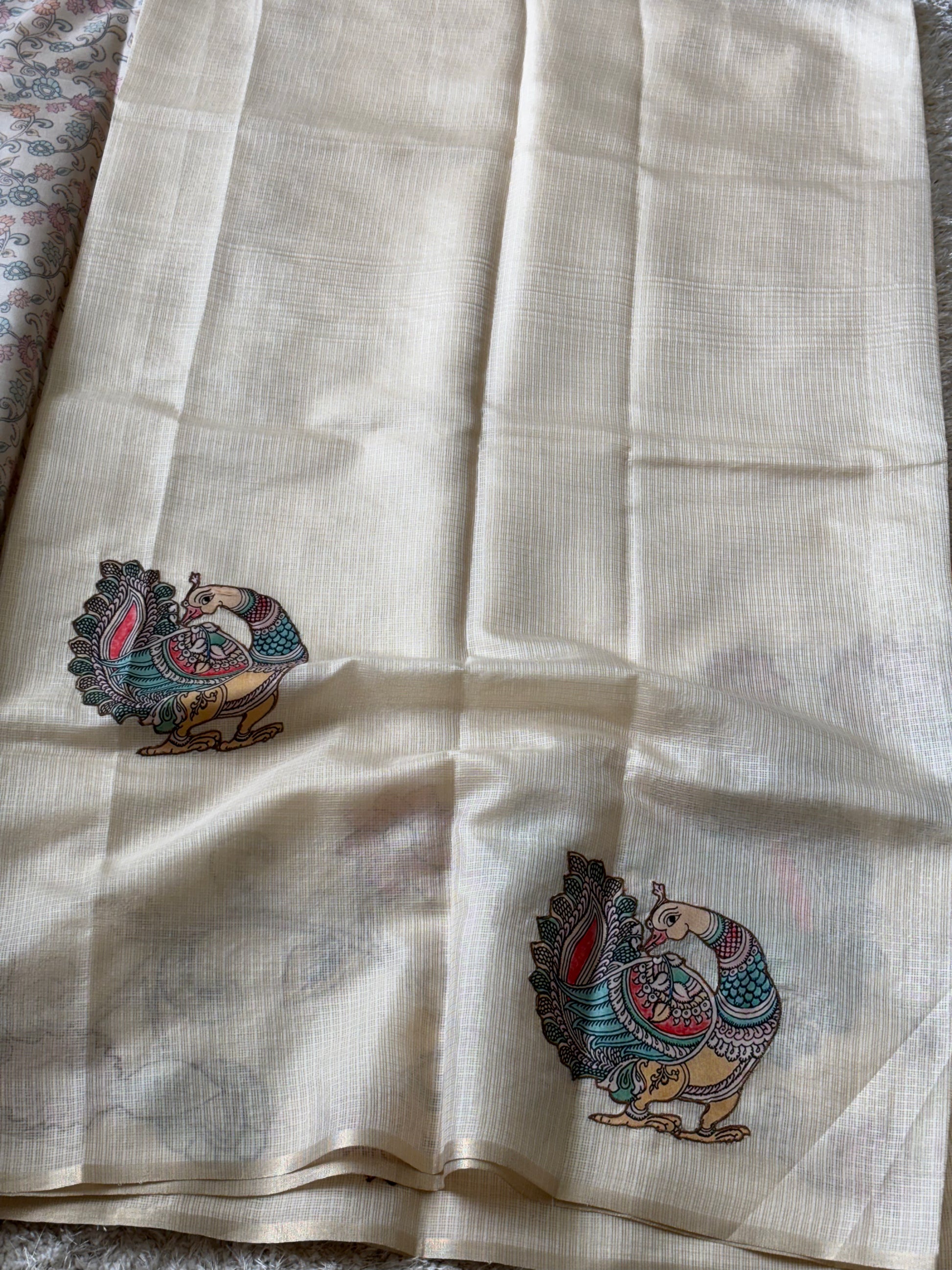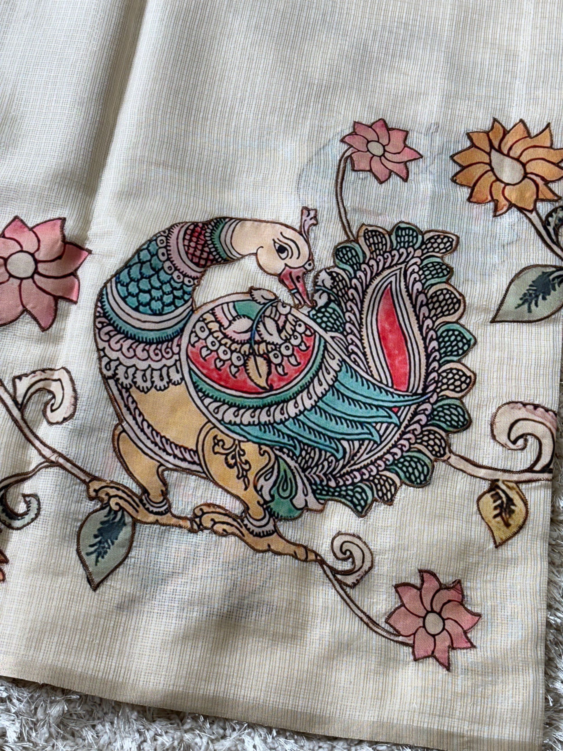 Cream saree with exquisite hand brush paint appliqué work, featuring floral detailing that makes it truly unique.