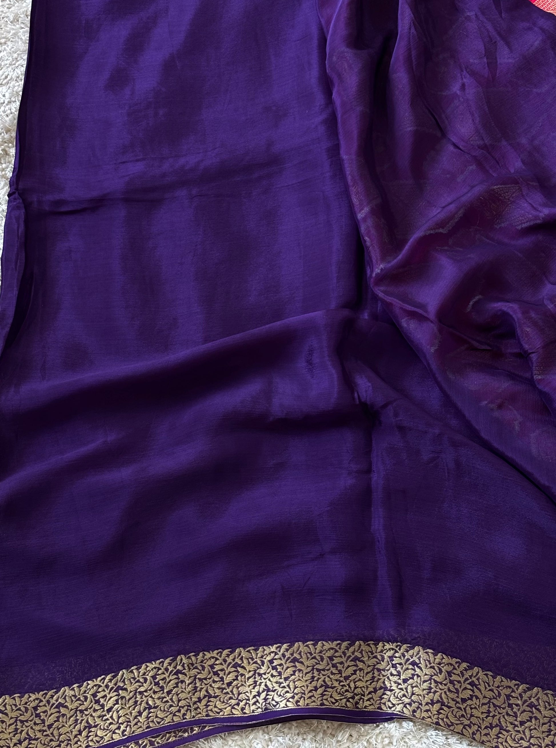 Satin Crepe saree is plain with a smooth texture, giving it a graceful fall. Border & Pallu has rich golden zari weaving with floral and striped designs, making it look festive and royal.