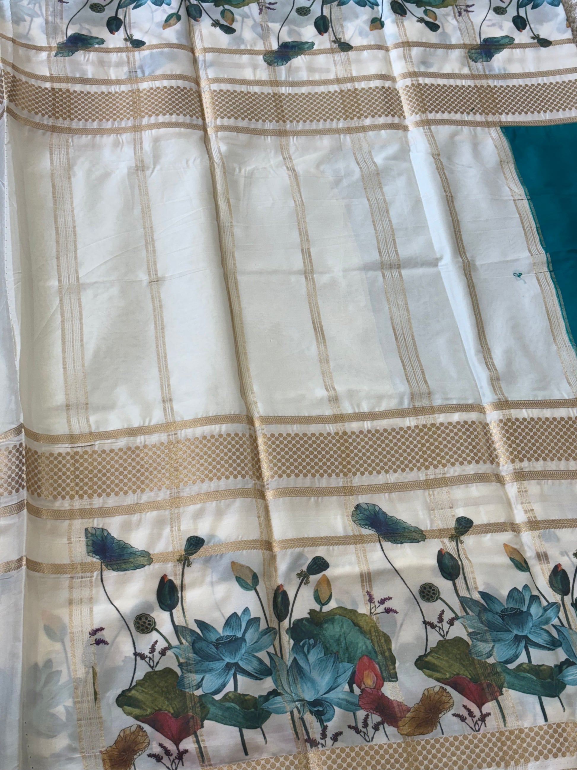 Beautiful semi Mysore crepe silk saree with a rich pallu and a cream body. It features lovely lotus and bird prints that give it an elegant and traditional look. Perfect for festive and special occasions.