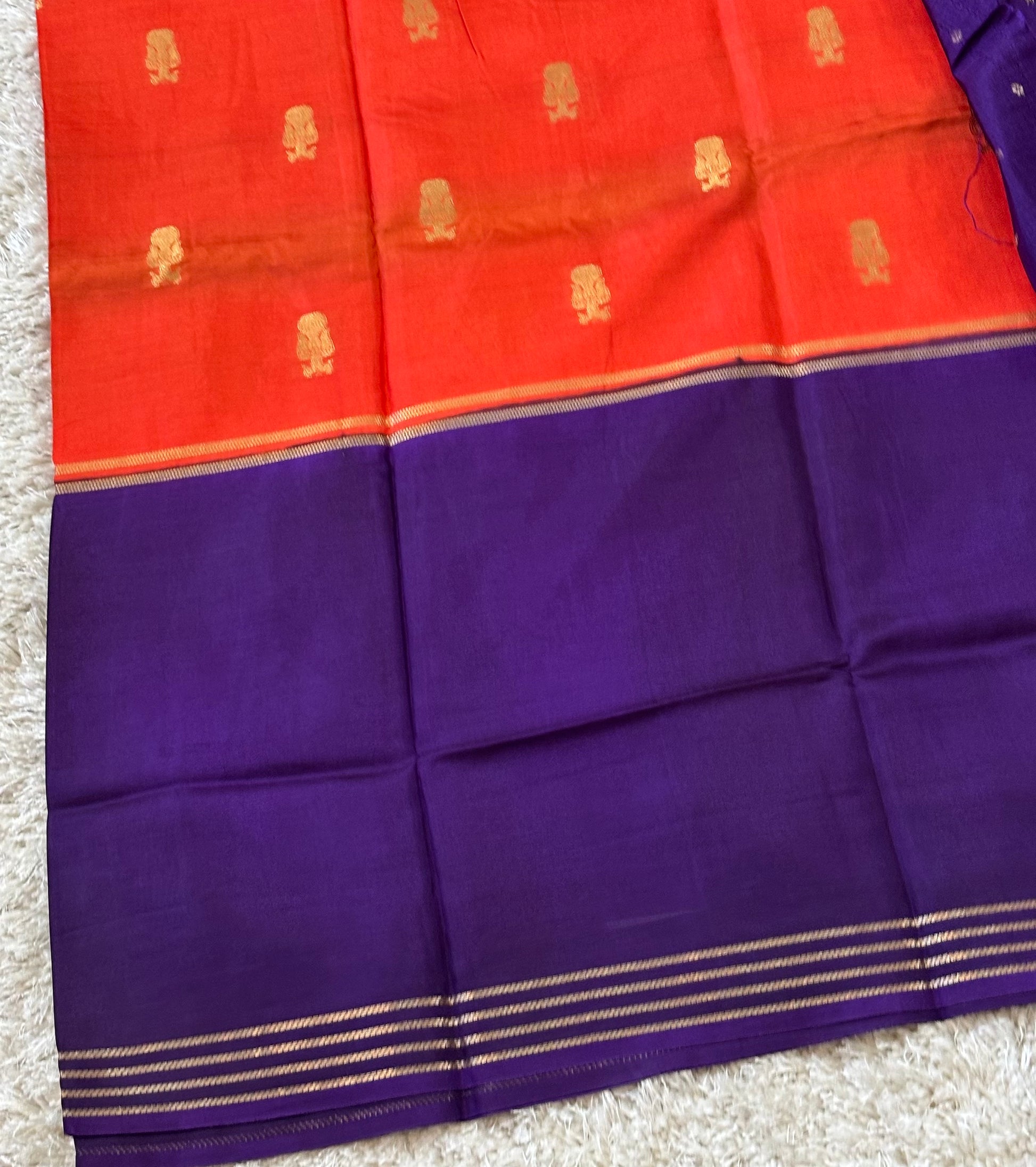 Semi Mysore Silk saree, adorned with golden Gandaberunda motifs. The rich contrast and smooth silk texture make it perfect for festive and traditional occasions.