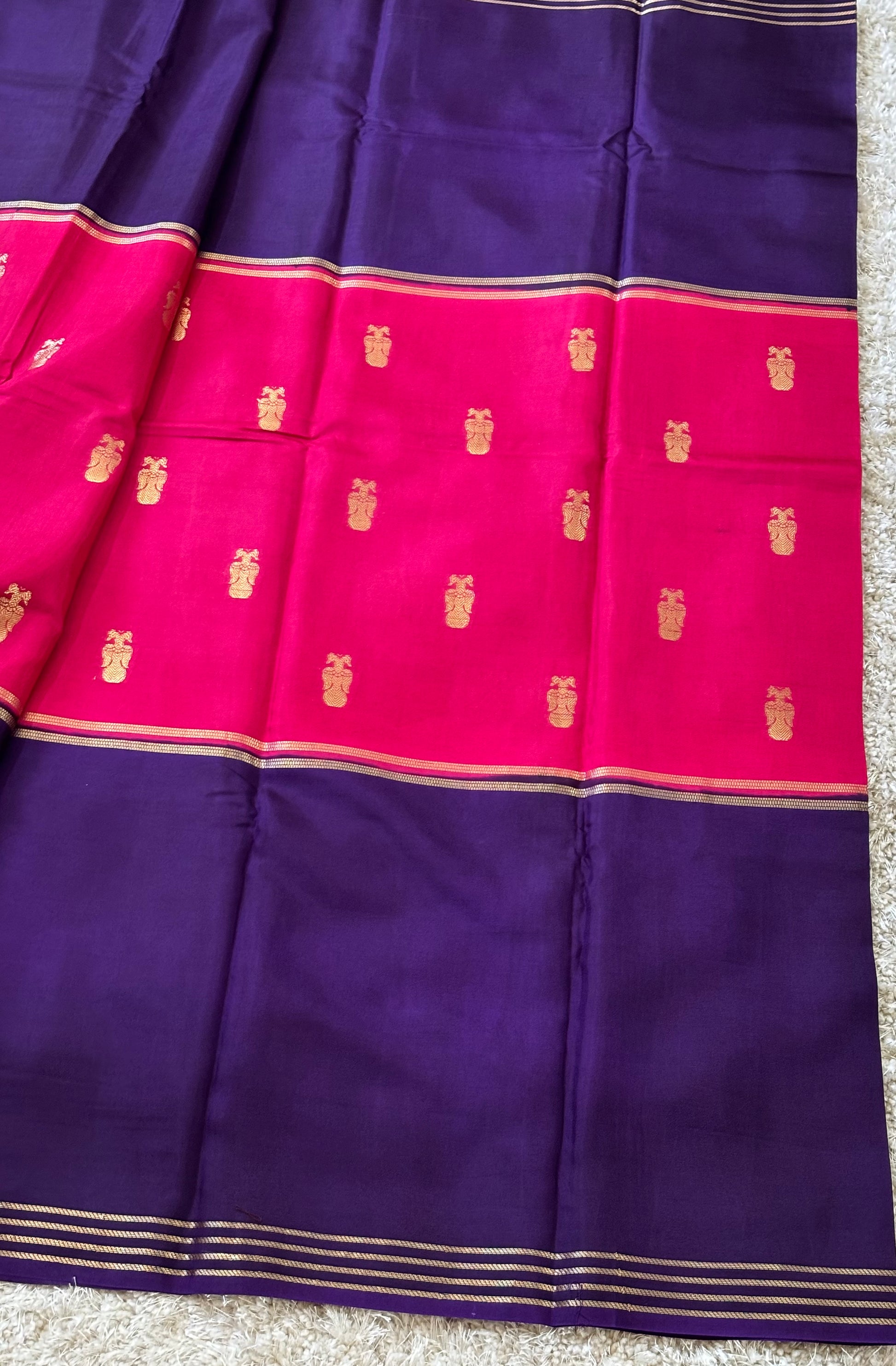 Semi Mysore Silk saree, adorned with golden Gandaberunda motifs. The rich contrast and smooth silk texture make it perfect for festive and traditional occasions.
