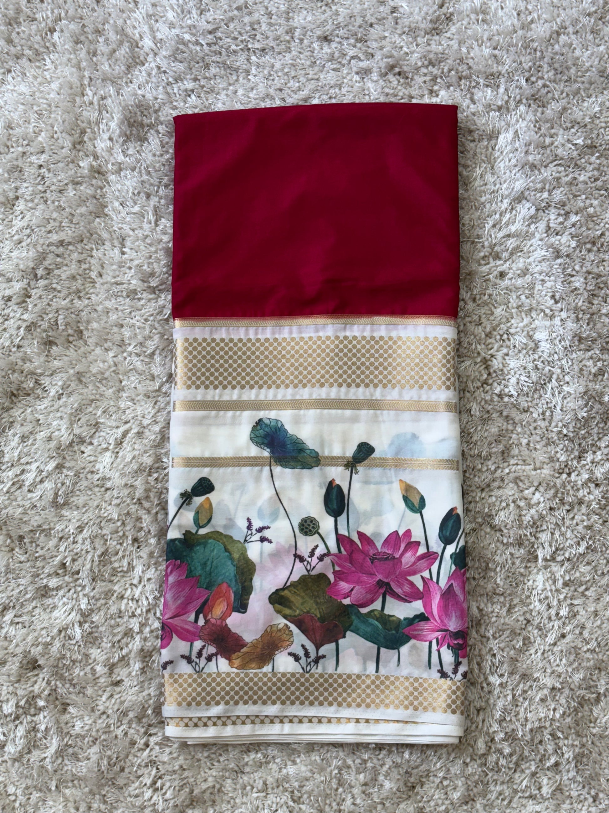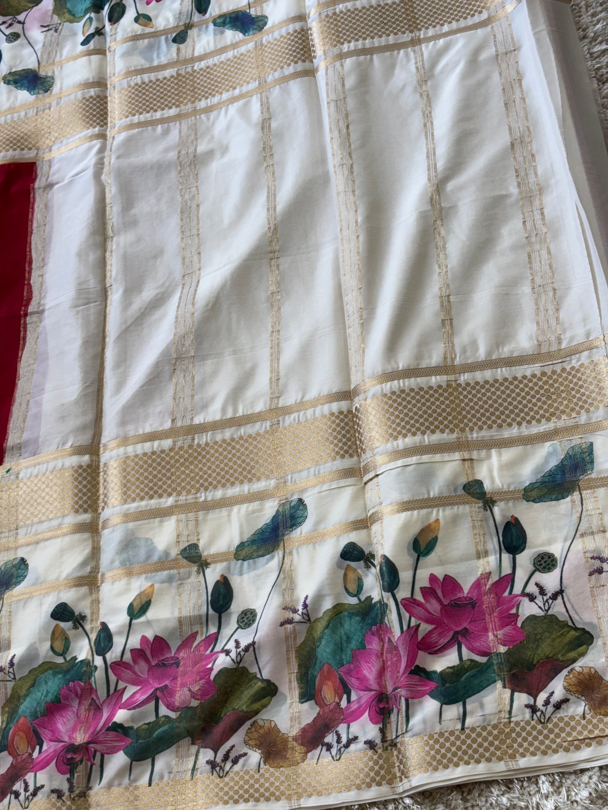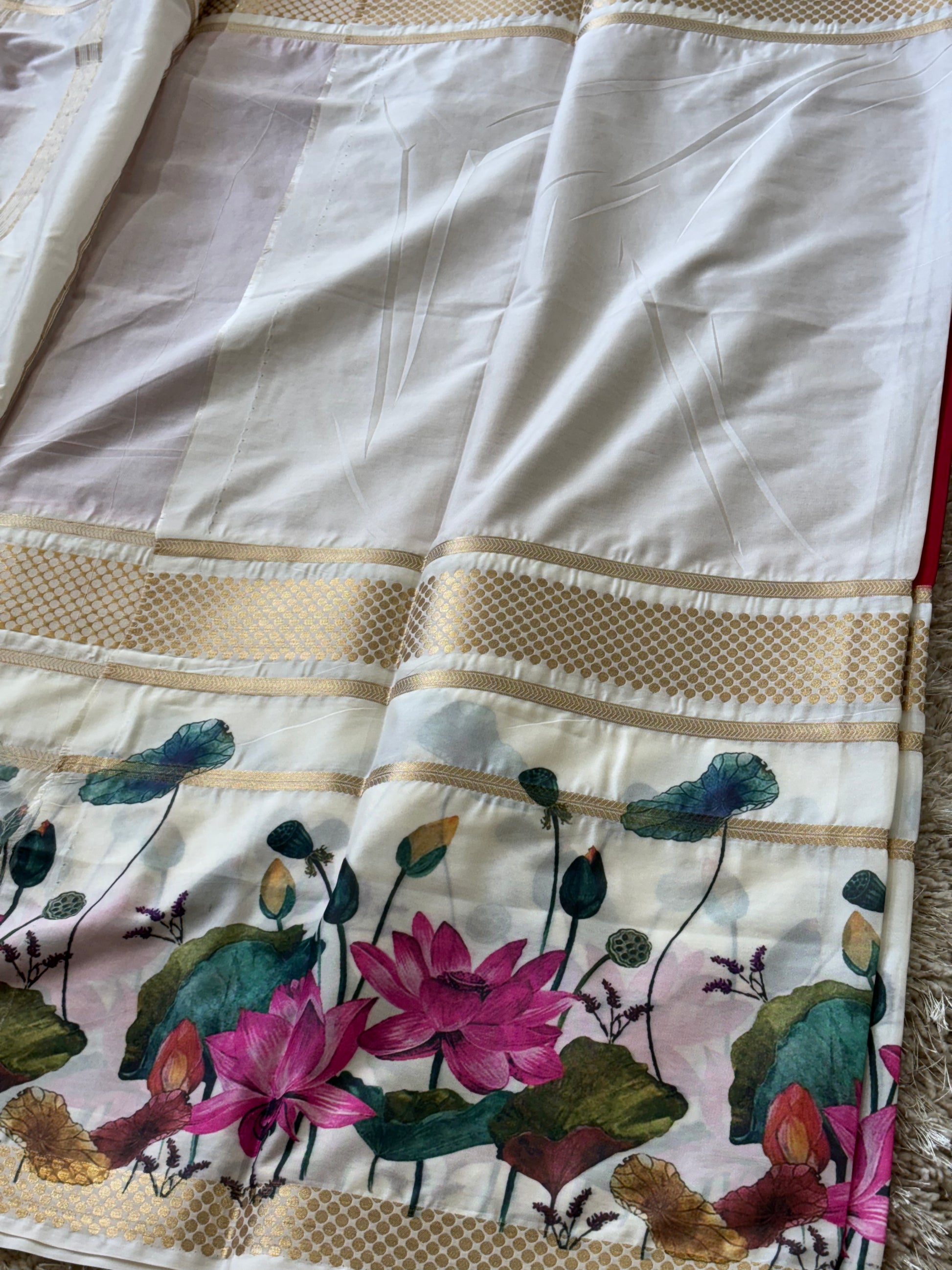 Beautiful semi Mysore crepe silk saree with a rich pallu and a cream body. It features lovely lotus and bird prints that give it an elegant and traditional look. Perfect for festive and special occasions.