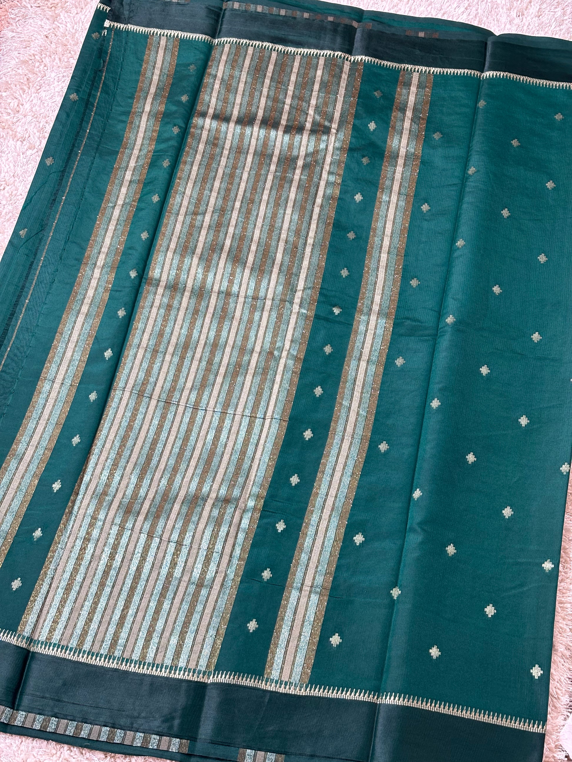 Cotton blend saree with buttas all over, finished with a sleek border and a rich striped zari pallu.
