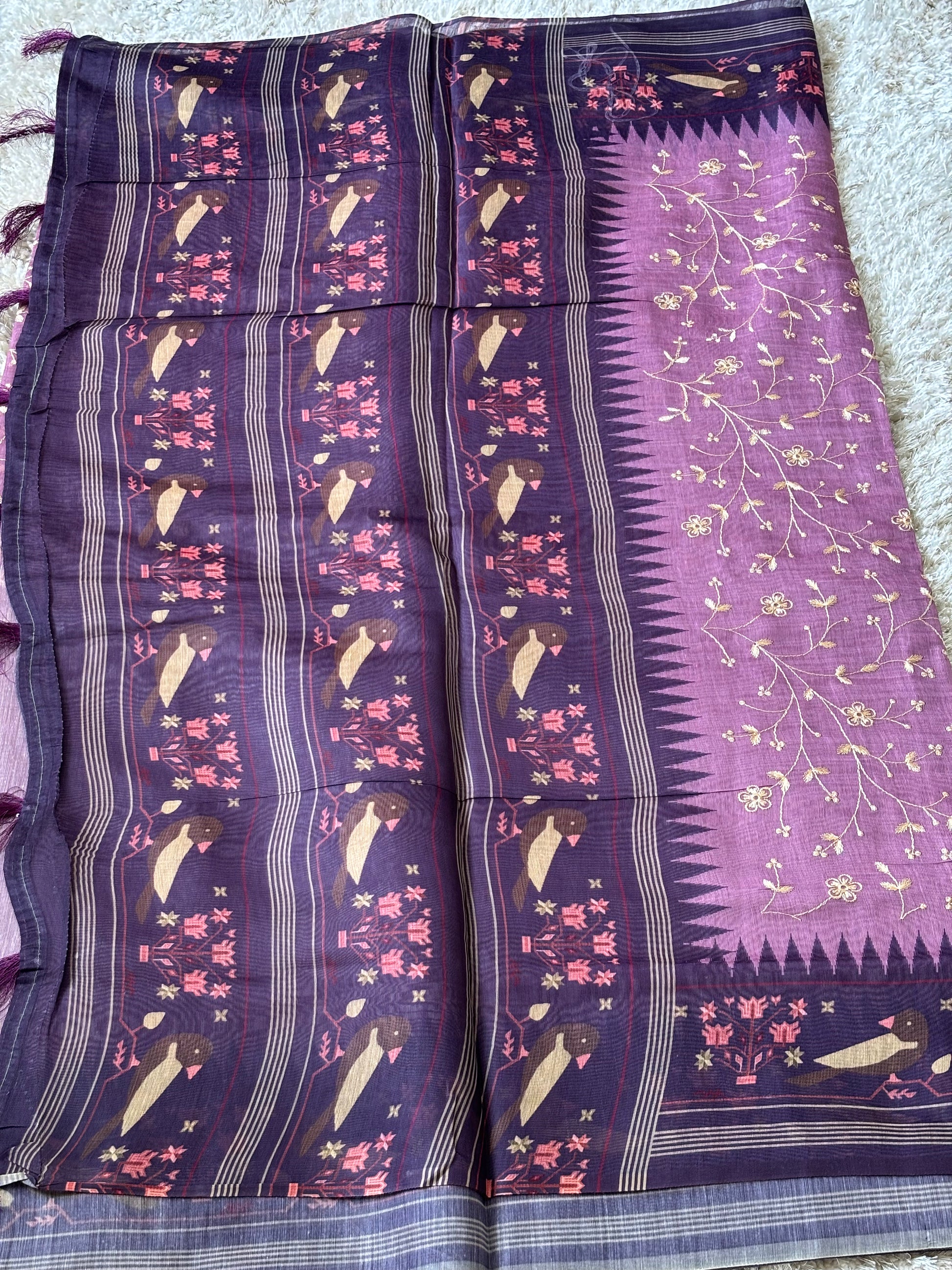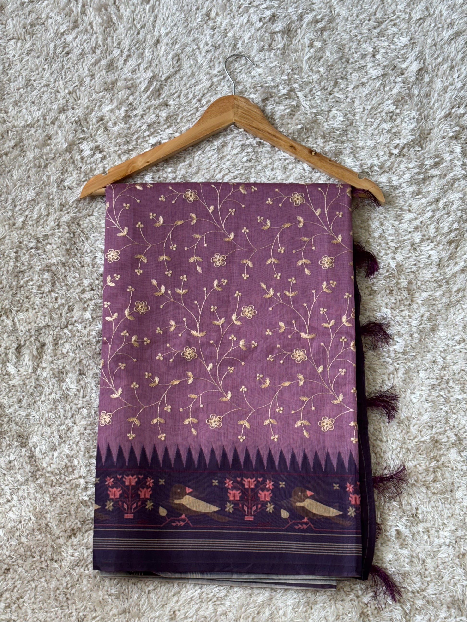Soft Chanderi saree adorned with delicate thread work — lightweight, elegant, and perfect for both festive and casual occasions. Its subtle sheen and intricate detailing add timeless charm.