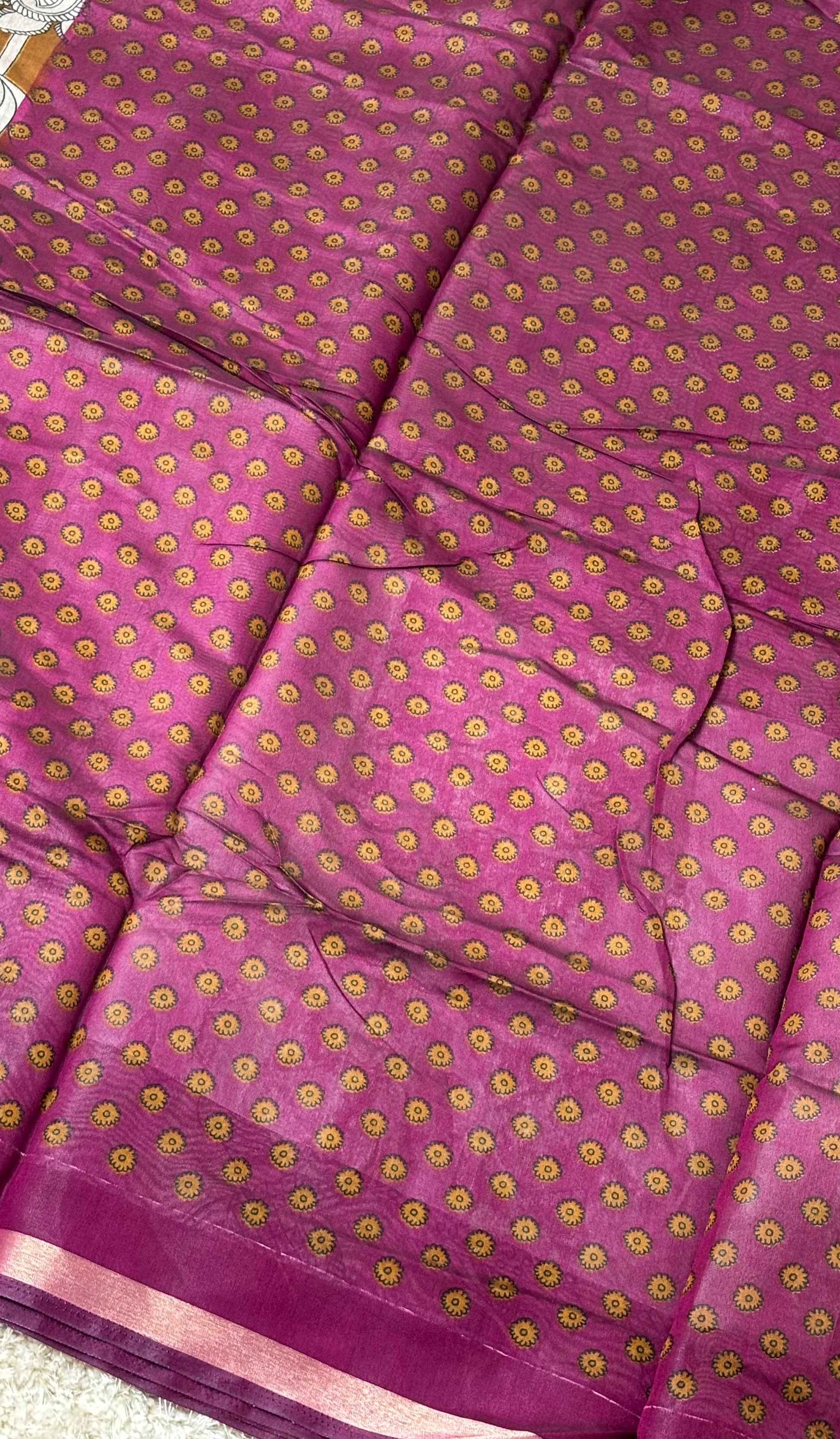 Magenta soft cotton silk blend saree beautifully adorned with silver zari peacock and floral motifs. The smooth texture and elegant navy border add a refined touch, making it perfect for festive wear or special occasions.