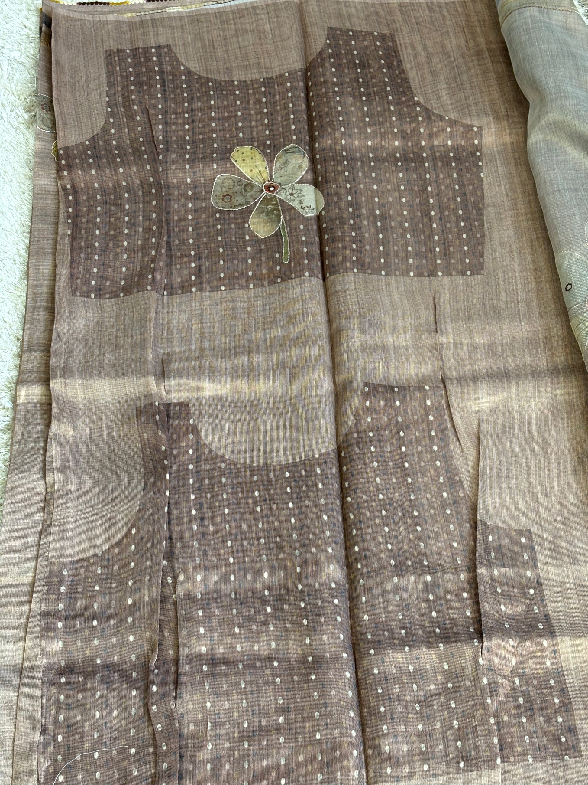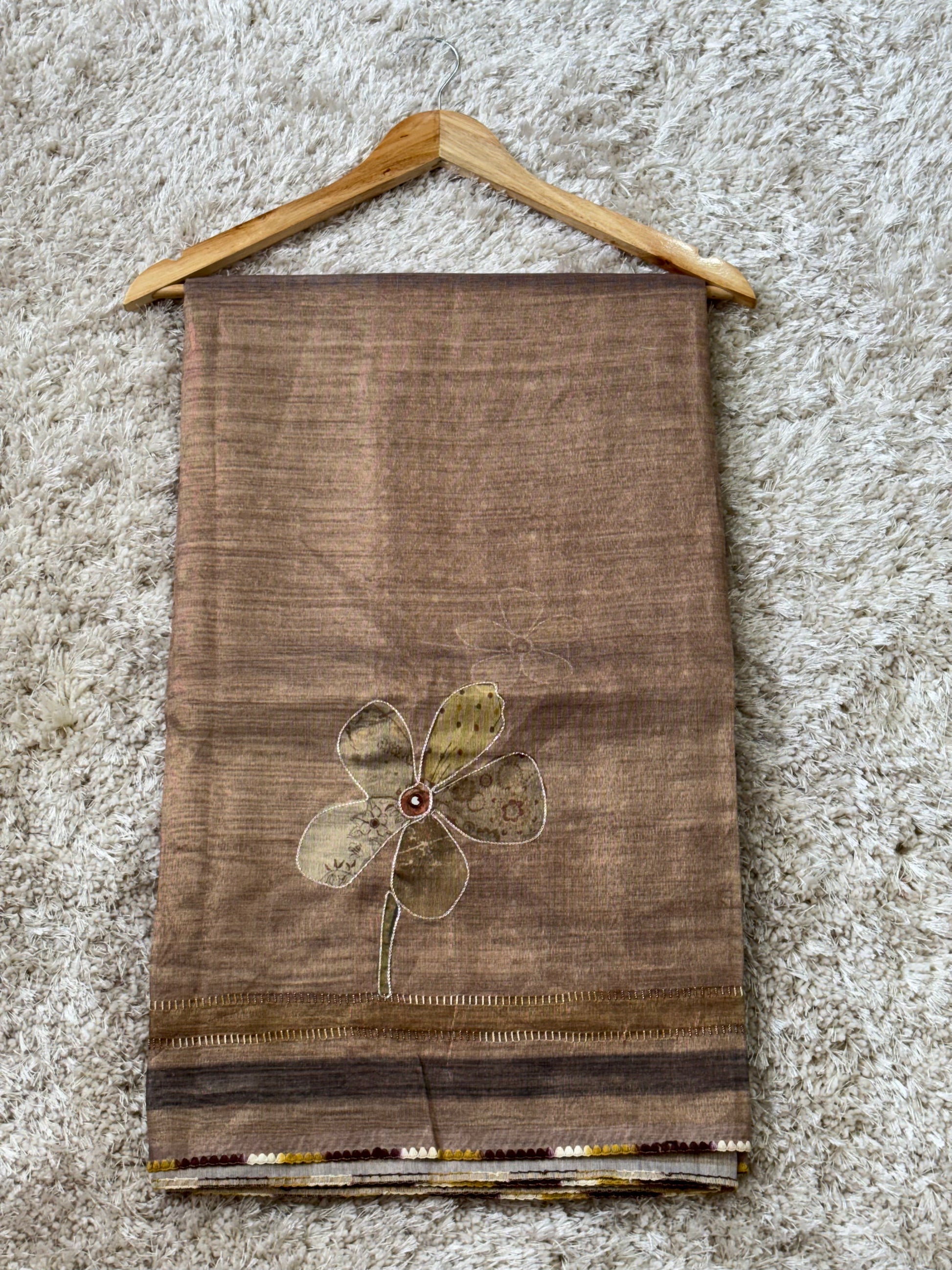 Tissue cotton saree adorned with beautiful flower motifs — light, elegant, and perfect for festive or casual wear. Its subtle shimmer and floral charm add a graceful, timeless appeal.