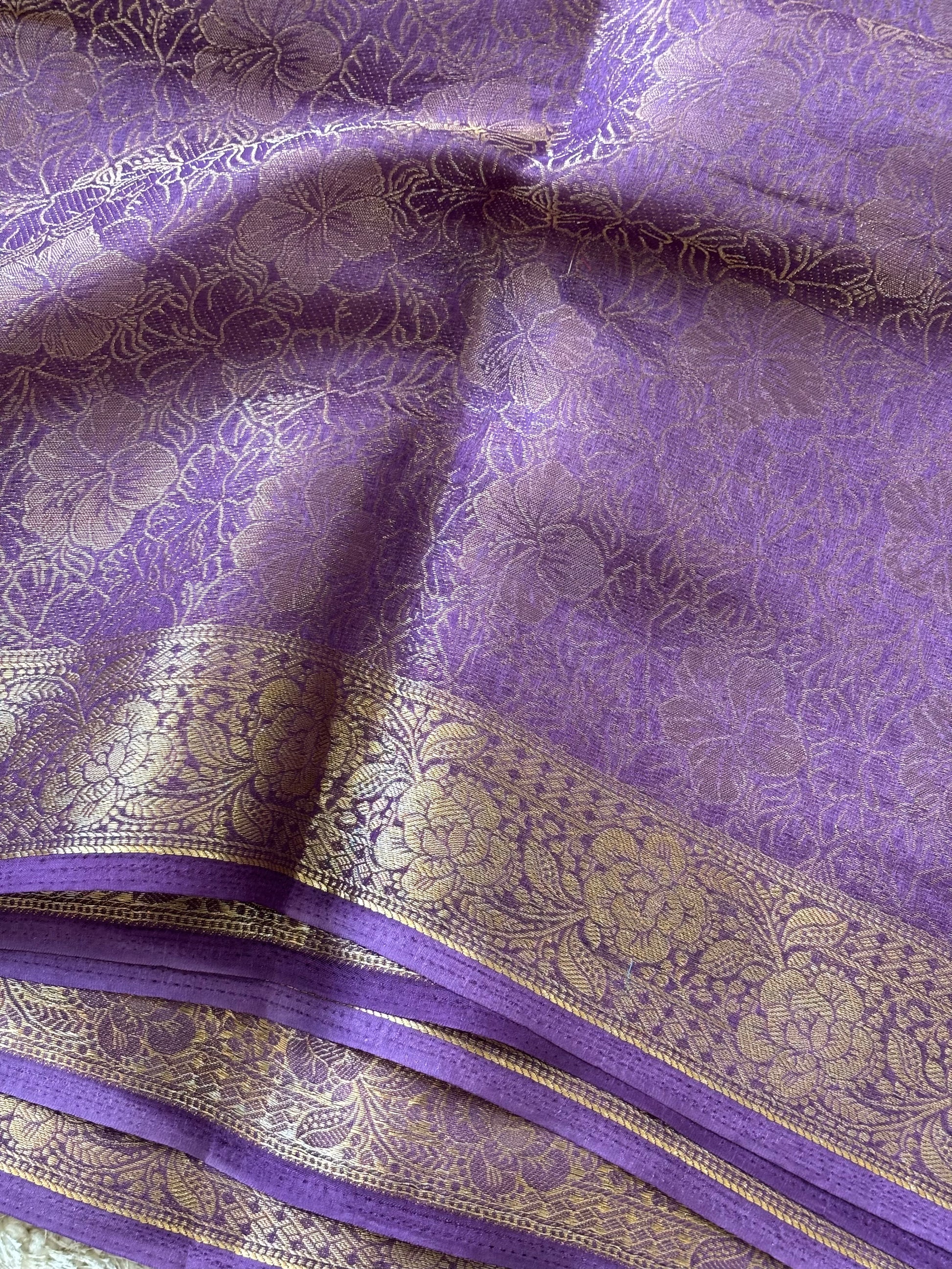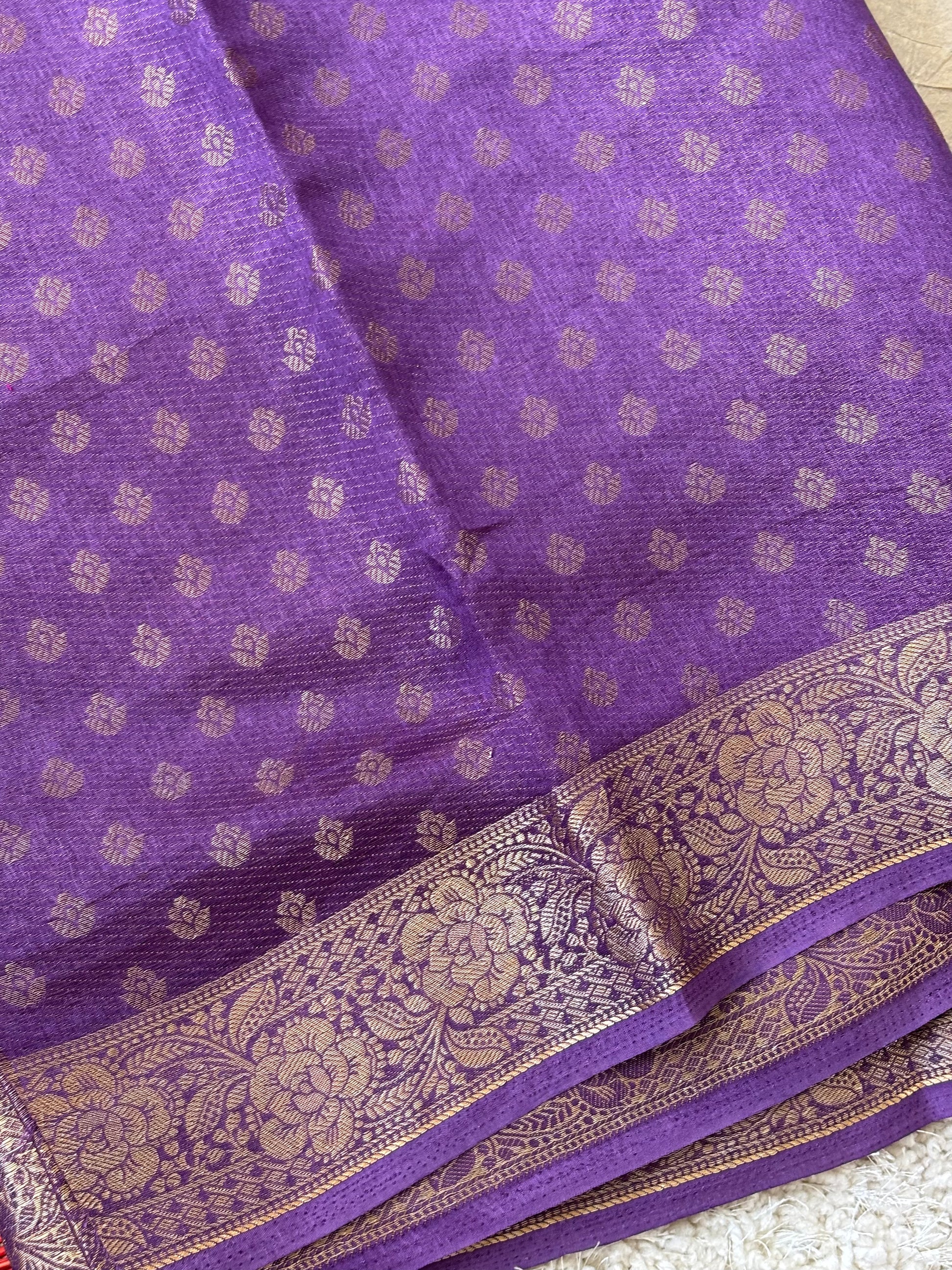 Tissue Silk Saree with elegant golden zari on the border and pallu. The body has a soft, subtle design that makes it look rich yet lightweight. Comes with a matching self-color blouse with delicate buttas. Perfect choice for festive occasions, functions, or a special day.